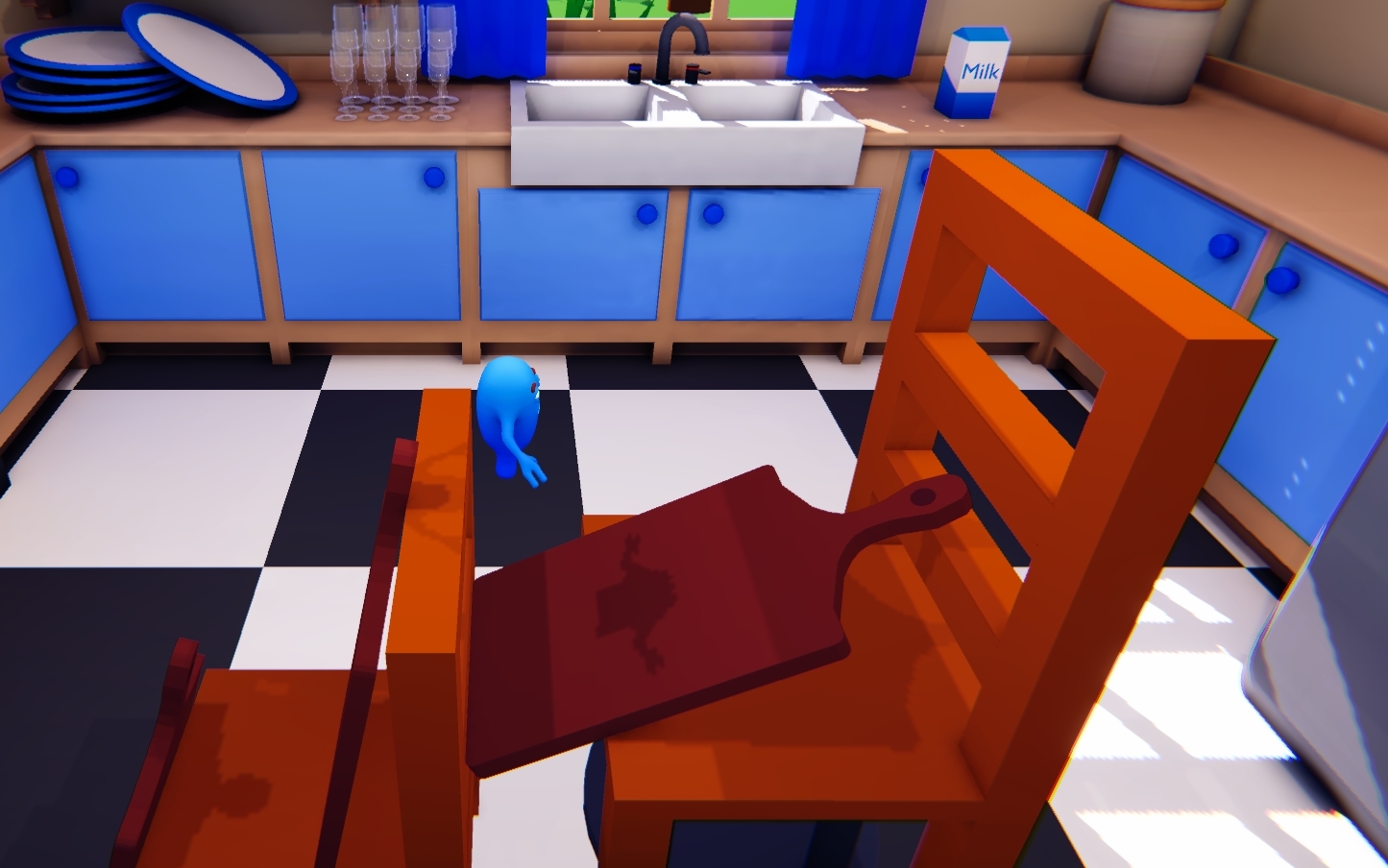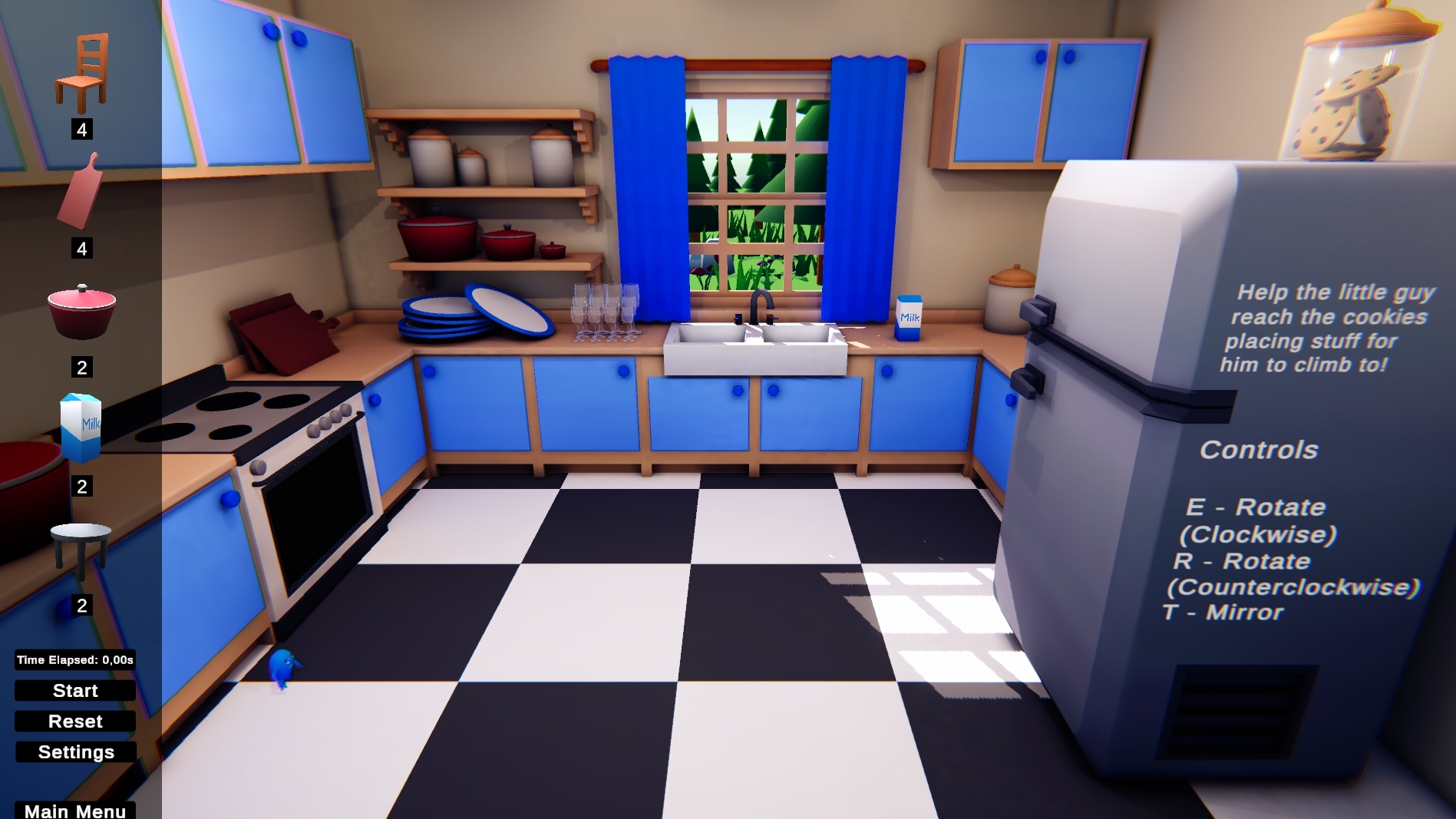 The object of the game is to help the Blue Monster reach the Cookie Jar on top of the fridge, you can do it stacking furniture and props for him to climb to!